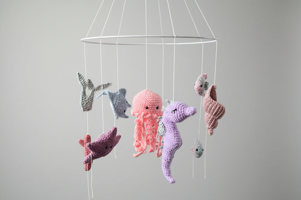 Each creature is crocheted by hand using 100% cotton yarn. There are no machines, no patterns, no shortcuts. A single nudibranch takes 3–4 hours. A fish or seahorse takes 5–6. Our baby mobiles take 15–20 hours of dedicated work.